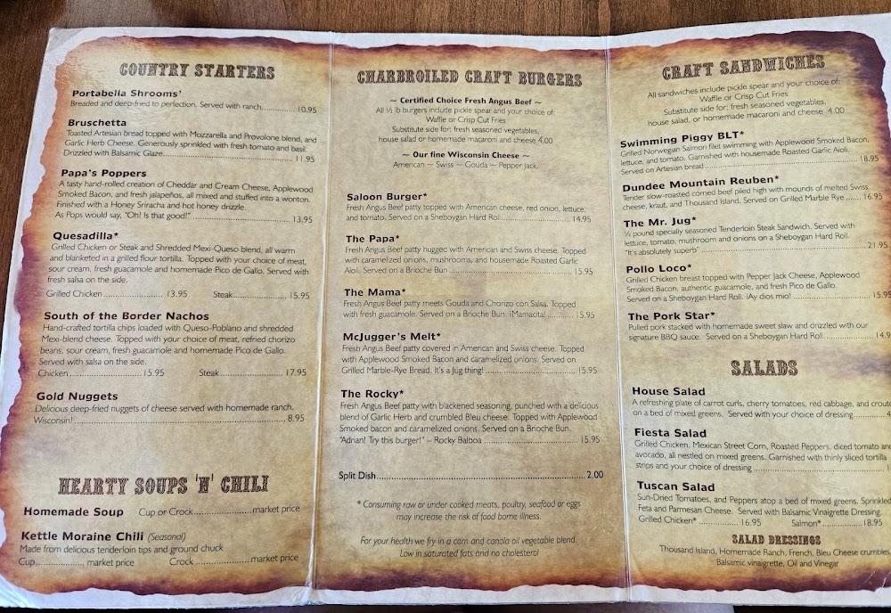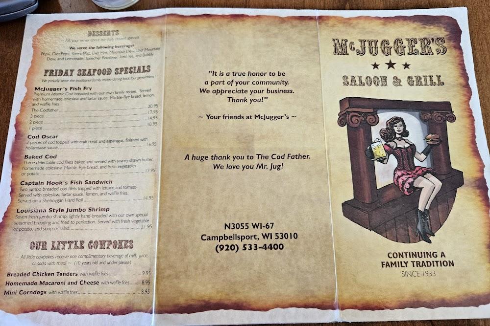 Welcome to McJugger's Saloon & Grill, your ultimate dining destination in Campbellsport, WI! Nestled at N3055 WI-67, we offer a cozy and relaxed atmosphere perfect for solo diners and groups alike. Indulge in our mouthwatering grilled specialties, accompanied by a wide selection of beers and expertly crafted cocktails. Enjoy dining on our terrace or opt for takeout and delivery services. With our friendly staff, happy hour discounts, and wheelchair-accessible amenities, we ensure a delightful experience for everyone. Join us for lunch or dinner and savor the local flavors in a warm, inviting setting. Reach us at +1 920-533-4400 or [email protected].